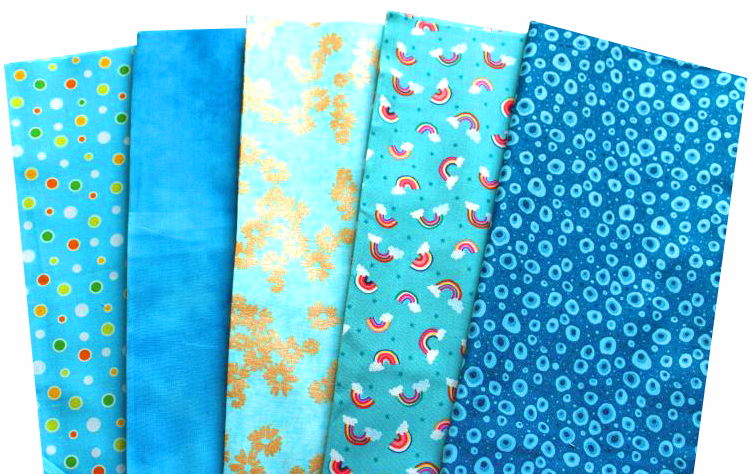 Das Paket enthält fünf verschiedene Basicstoffe, die beiden linken sind 25 x 105 cm, der mittlere 35 x 105 cm, der zweite von rechts ist 40 x 105 cm und der ganze rechte Stoff 50 x 105cm.